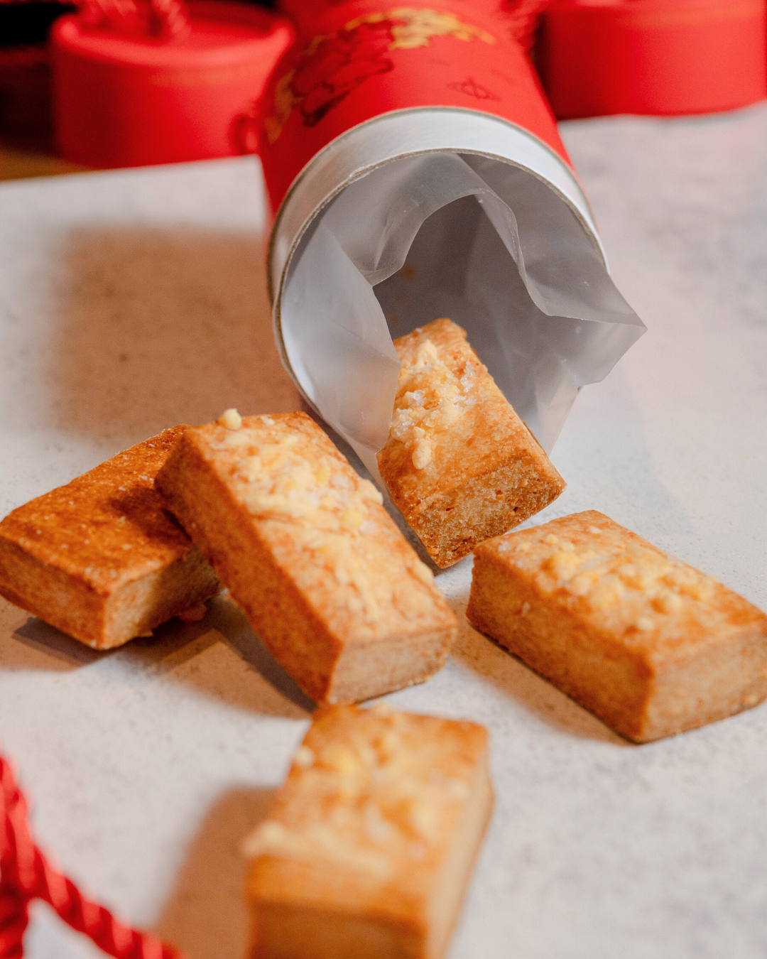 A savoury, crumbly shortbread infused with a rich blend of four cheeses (Gouda, Edam, Emmental, and Cheddar). Each cracker is hand-cut, generously topped with more cheese, and baked until perfectly golden.